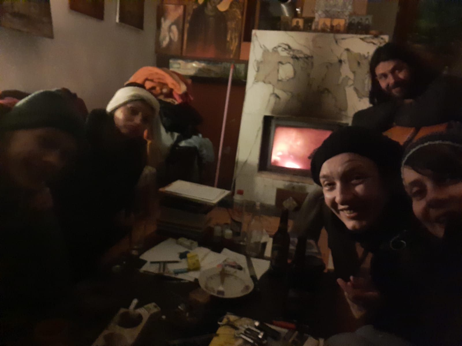 Der Abend klang aus in einer filmreifen Kulisse eines gedrungenen, kleinen, alten Ateliers, vollgestopft mit Leinwänden und Malerequipment, einem kleinen Kamin als einziger Wärmequelle und einem alten durchgelegenen Sofa, das Dimitros als Bett diente – ein richtiges Künstlerdasein eben.