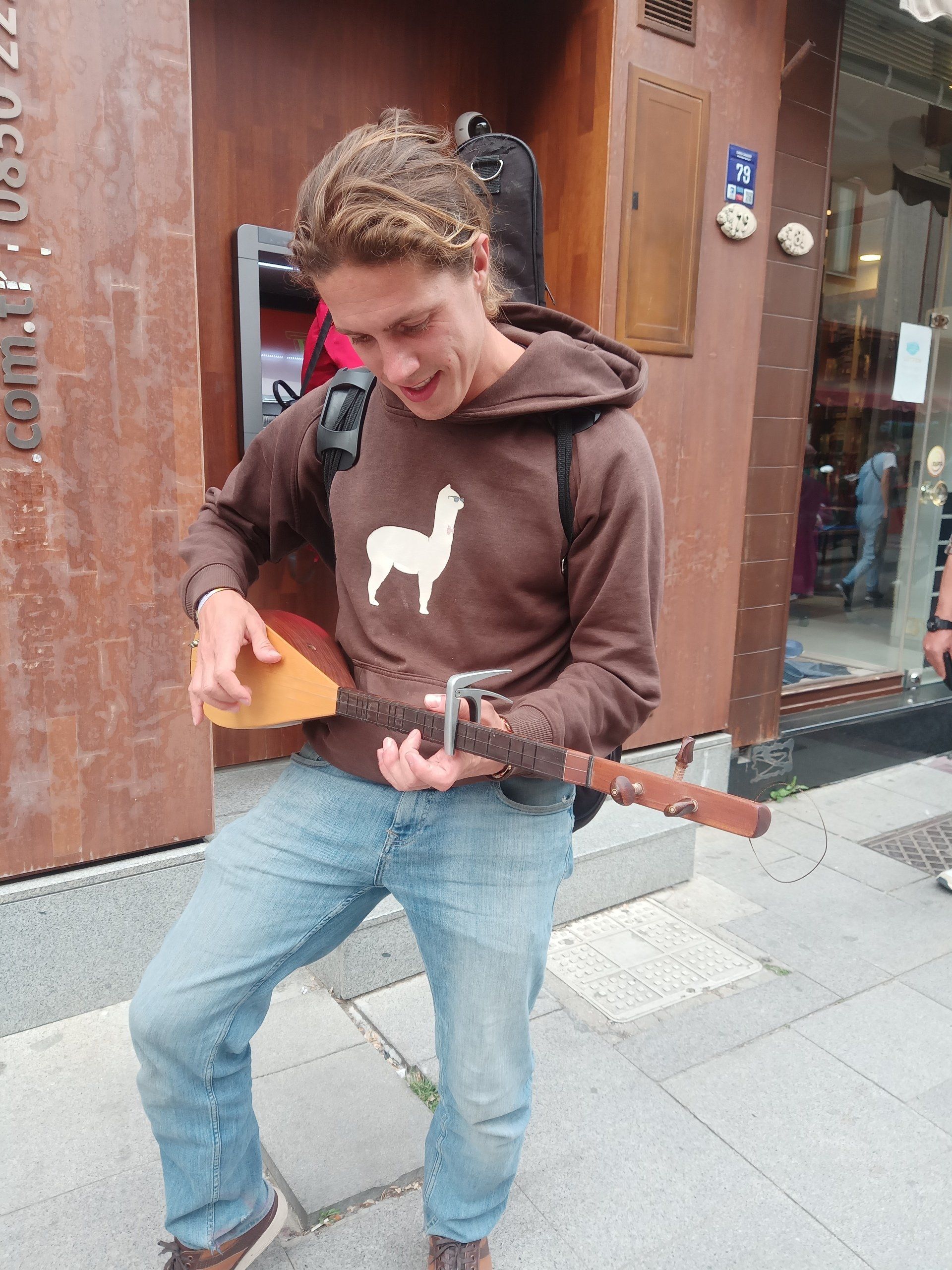 Auf der anderen Straßenseite gesellt sich ein währenddessen ein anderer Musiker zu den Zuhörern, in der Hand eine bağlama, die typische 3-saitige Gitarre und hört gebannt bis zum letzten Ton zu. Wir geraten in eine freundschaftliche Fachsimpelei über unsere musikalischen Herkünfte und selbstredend probiere ich mich auch einmal an dem Instrument, nachdem wir fertig sind.