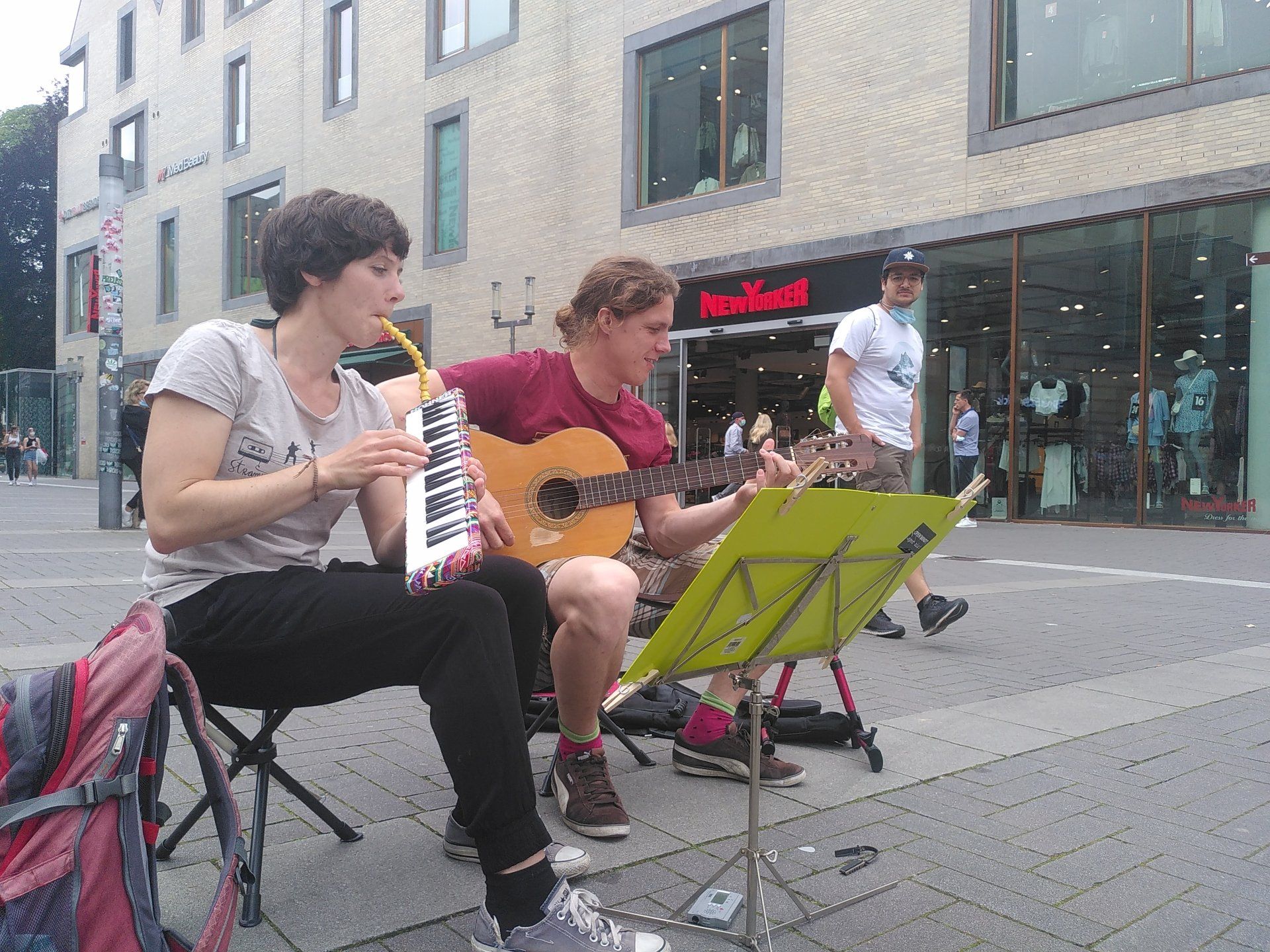 Dieser Plan hat ganz wunderbar zur Stadt Münster gepasst, weil sie ihrem Ruf nach eine sehr Straßenmusiker-freundliche Stadt ist, was wir nun nur bestätigen können: Es ist keinerlei Anmeldung oder Genehmigung nötig und das Ordnungsamt winkt einem fröhlich zu :)