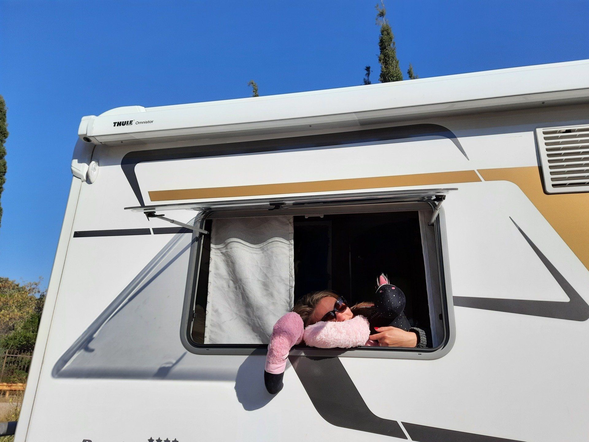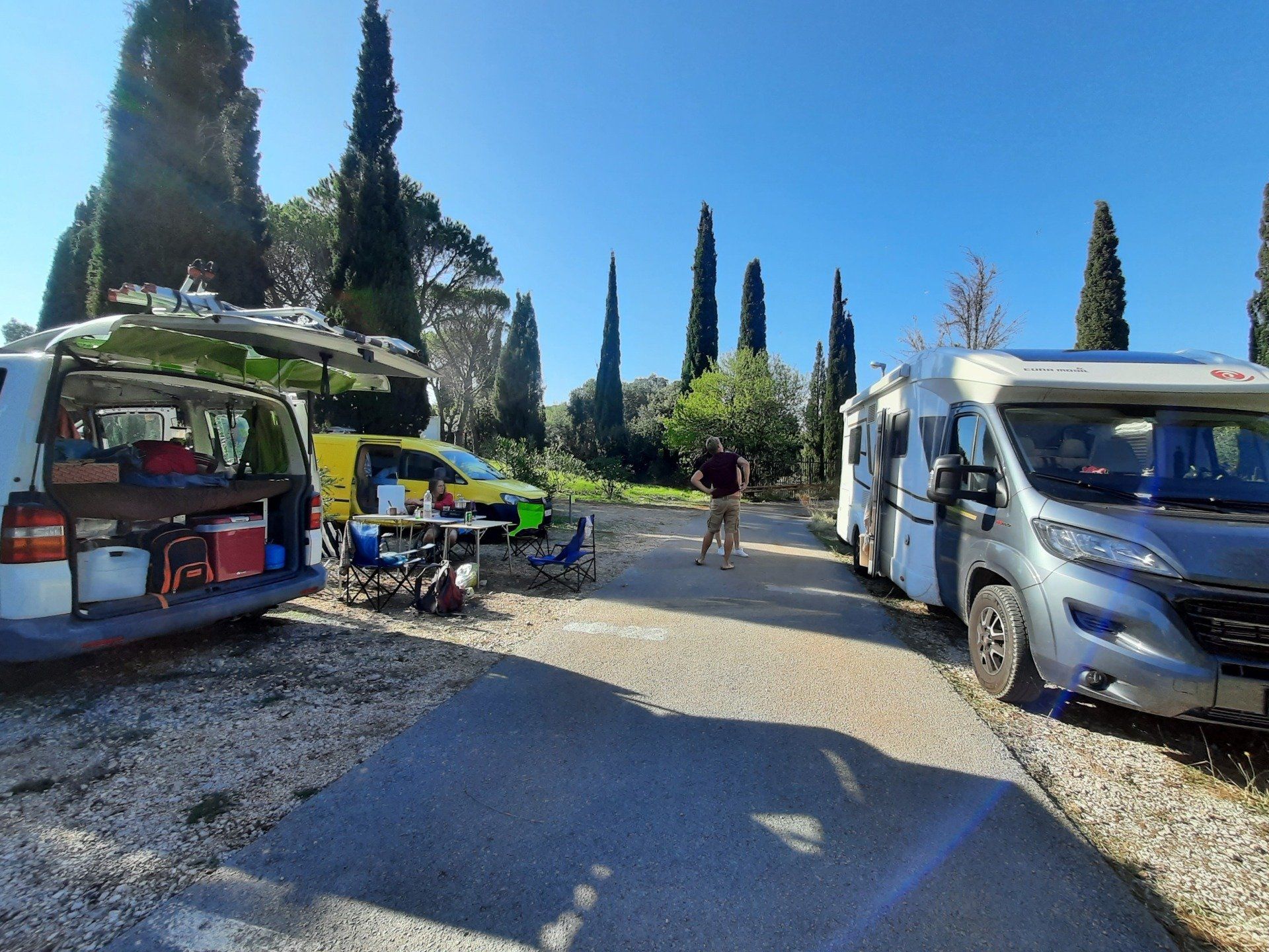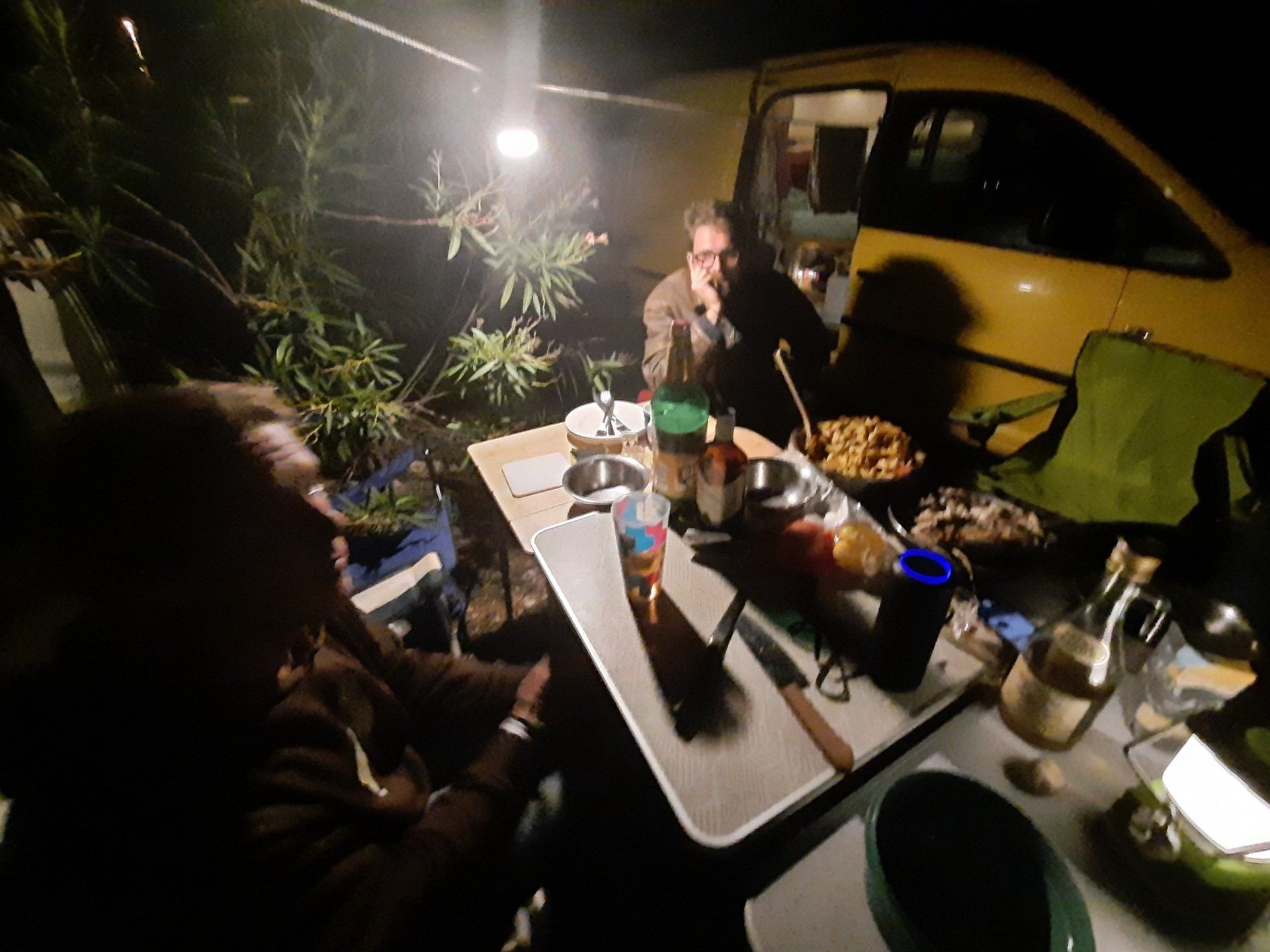 Und so kommen wir am Abend mit Mark und Steffi zusammen, stellen fest, dass wir den gleichen Musikgeschmack teilen, dürfen ihre Kochnische mitbenutzen und weil es draußen so windet, rutschen wir auf dem Bettsofa drinnen im kleinen Postauto zusammen und genießen kroatisches Bier aus überdimensional großen 2L-Flaschen (die man gemeinsam leertrinken muss, damit nichts schal wird ;)