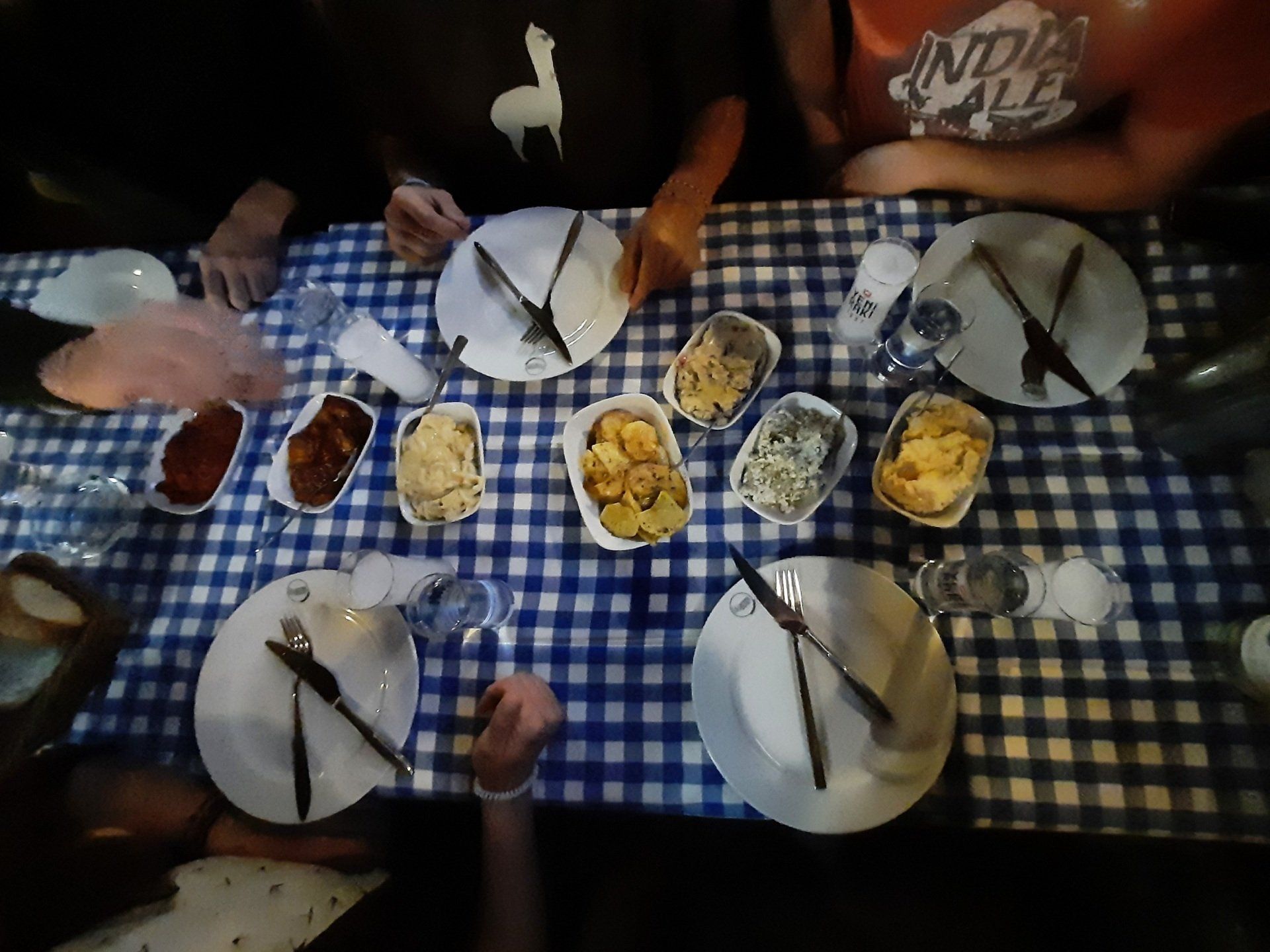 Meze – eigentlich nur ein Überbegriff für viele verschiedene Türkische 'Tapas', die man beim Besuch einer ➼Meyhane serviert bekommt. Dazu gehören z.B. Blätterteigröllchen, in Weinblätter eingeschlagener Reis, ein spezieller Algensalat, Shrimps, Bohnen oder Bohnenpaste, Käse, Tintenfisch, überbackene Champignons, gebratene Aubergine und unzählbar viele weitere Aufstriche, die meisten davon mit vieeeeel Joghurt. Wir waren insgesamt vier Mal in einer Meyhane und konnten daher einige der Leckereien probieren. Fun game: Wenn man keinen geübten türkischsprachigen Gastgeber, wie Matze einer war, dabei hat - einfach mal an den Tisch setzen und wild auf die Karte deuten, weil die Beschriftung nur auf türkisch ist und die Kellnerin kein Englisch kann. So haben wir das zumindest mit der Krissi gemacht und es kamen wunderbare, durchweg leckere Ergebnisse dabei heraus. :D